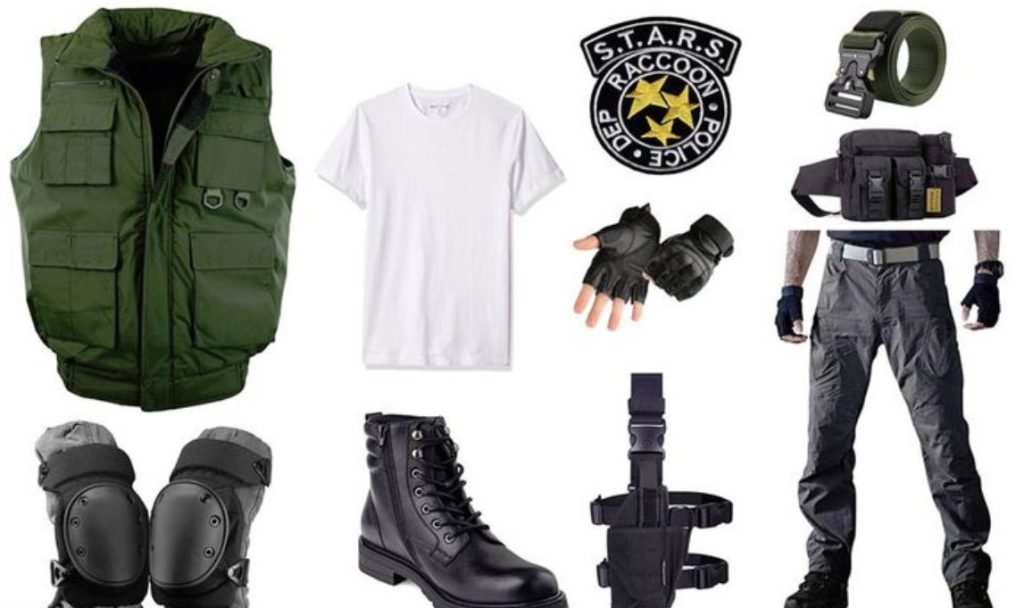 - RE1 Look: Green vest, S.T.A.R.S. patch, black cargo pants, toy Beretta.